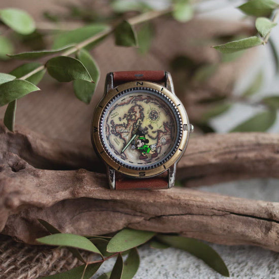 A lovely themed piece featuring an antiquated world map and glow in the dark hands. Safari Mickey explores the globe as he ticks the seconds away. A dark gold border, (debossed with cardinal points) sits atop the classic silver frame, topped with a flat crystal. Affixed with the original leather-and-canvas teal straps. A fun collector's item for folks who love to travel! Comes with original Mickey tin.