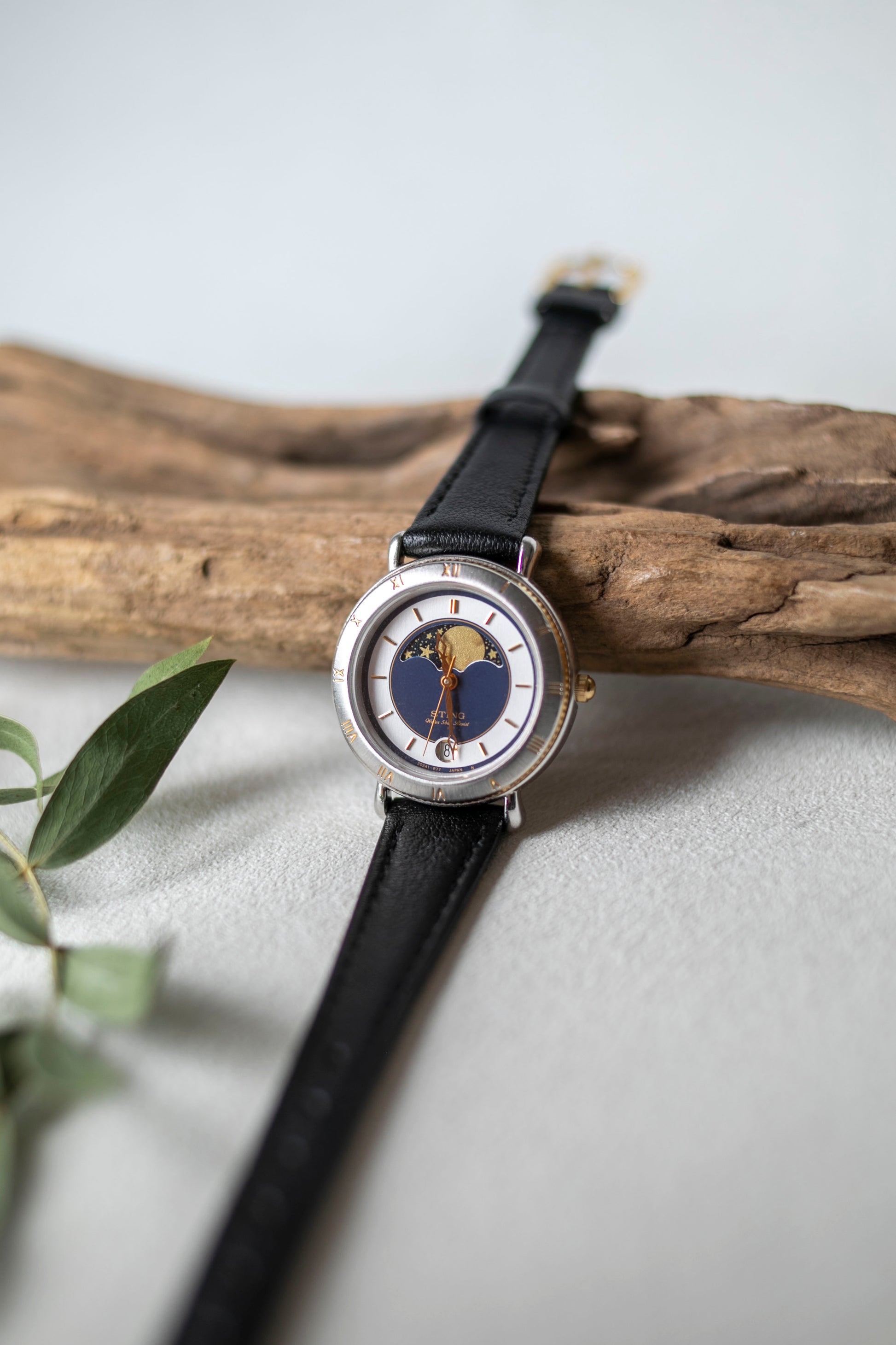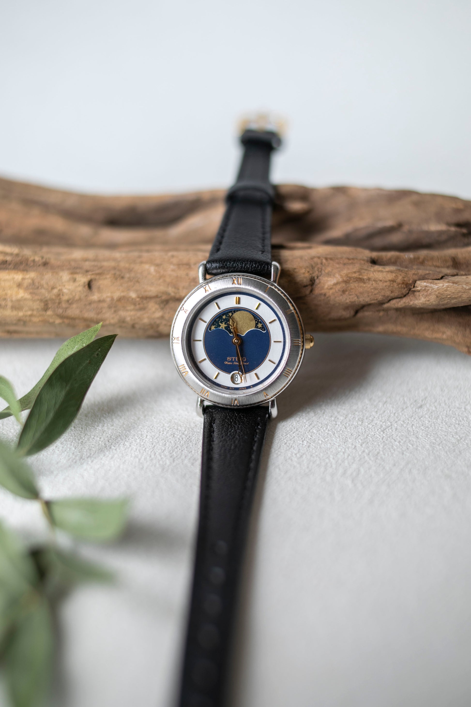 - Pale silver dial with blue center